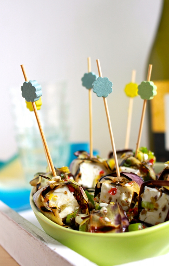 Halveer de aubergine in de lengte en hol de helften uit. Vul ze met een mengsel van feta, tomaat, olijven en verse kruiden zoals basilicum en oregano. Rol de gevulde aubergines op en zet ze vast met een prikker. Bak ze in de oven tot de vulling warm is en serveer ze als verrassend hapje voor je gasten.