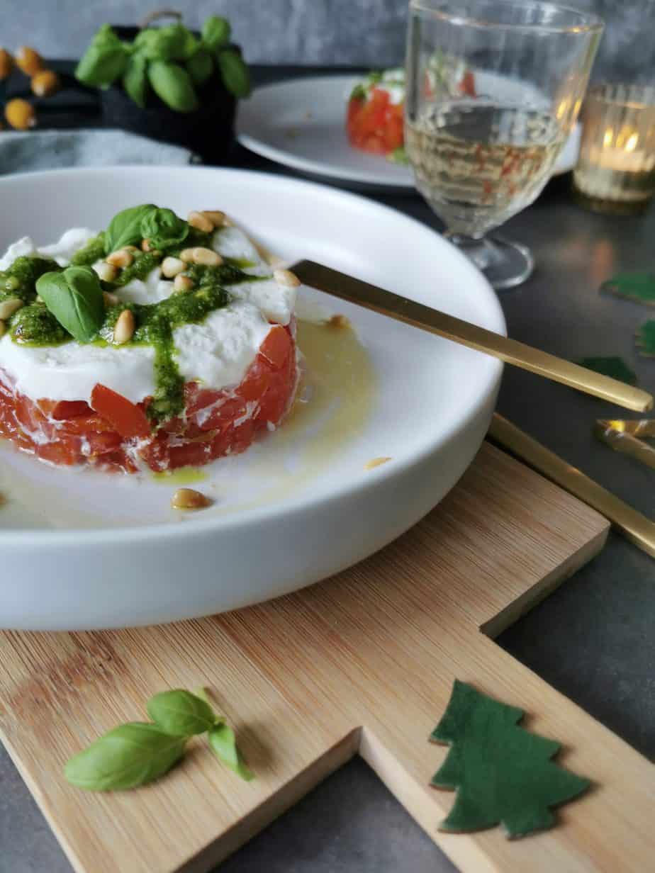 li>Snijd de tomaten in kleine blokjes en meng ze met fijngehakte basilicumblaadjes, olijfolie, zwarte peper en zout.
